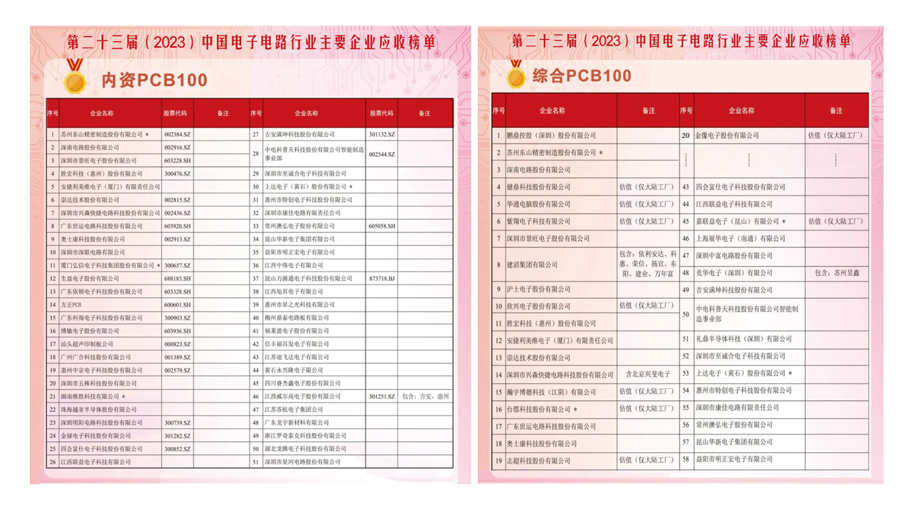 近期,中国电子电路行业协会(CPCA)正式发布了《第二十三届(2023)中国电子电路行业主要企业营收榜单》。bbin宝盈科技凭借稳健坚韧的市场表现与综合实力荣登2023年度内资PCB百强榜单第4名,同时在综合PCB排名中位列第11名。